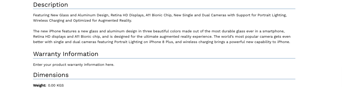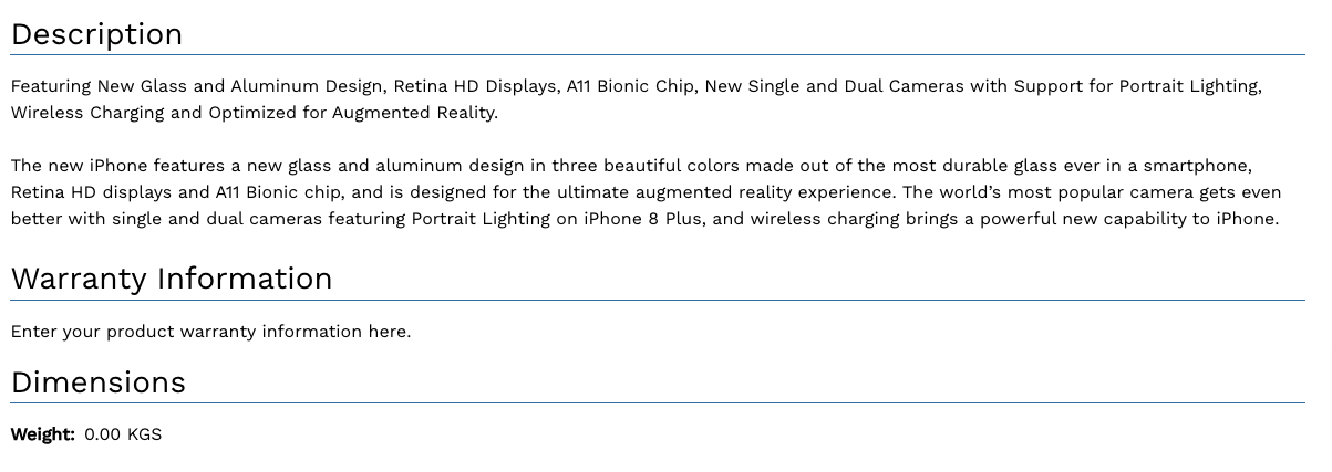 Displays product descriptions, additional information, dimensions and other product information panels as tabs or directly on the page.